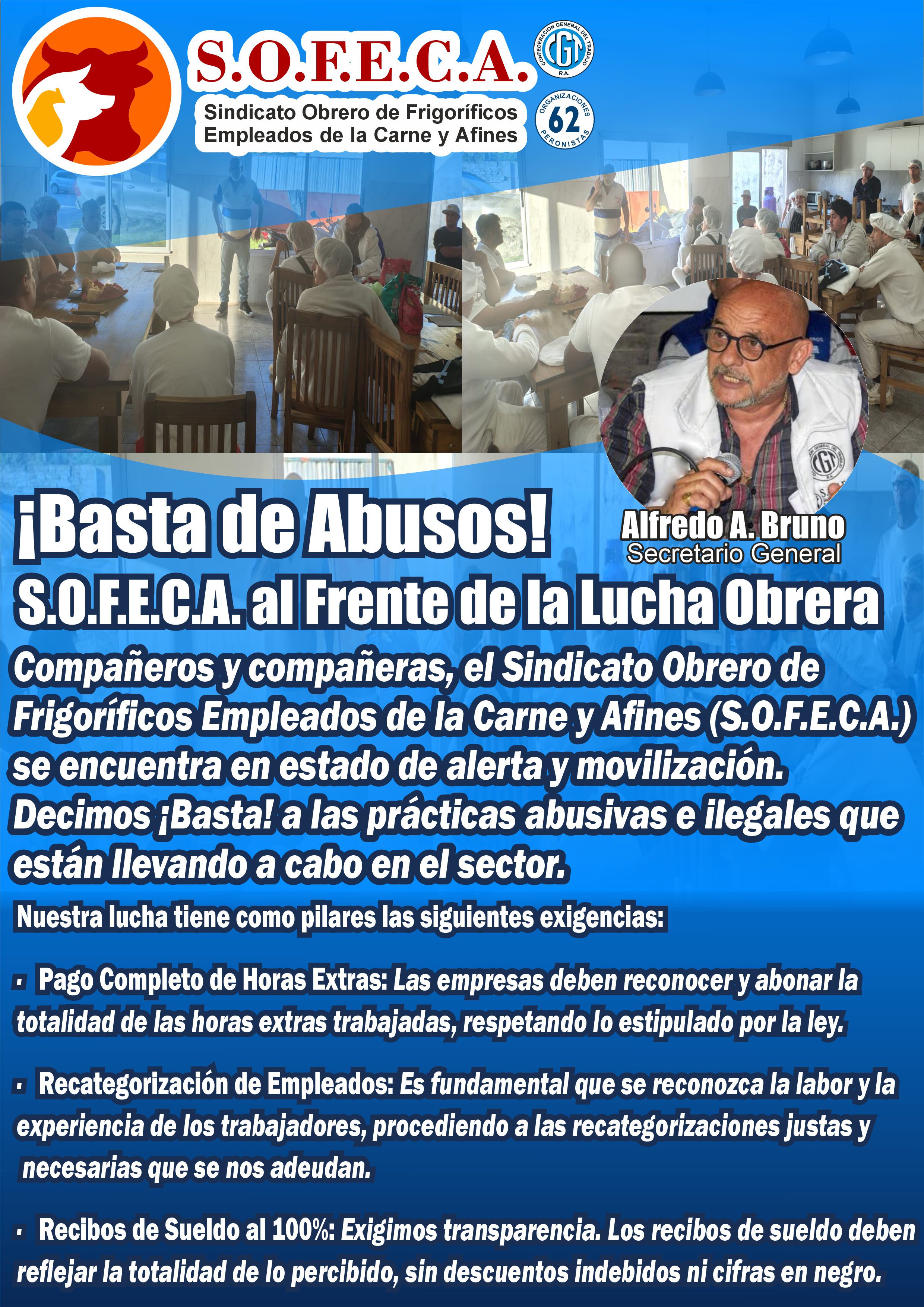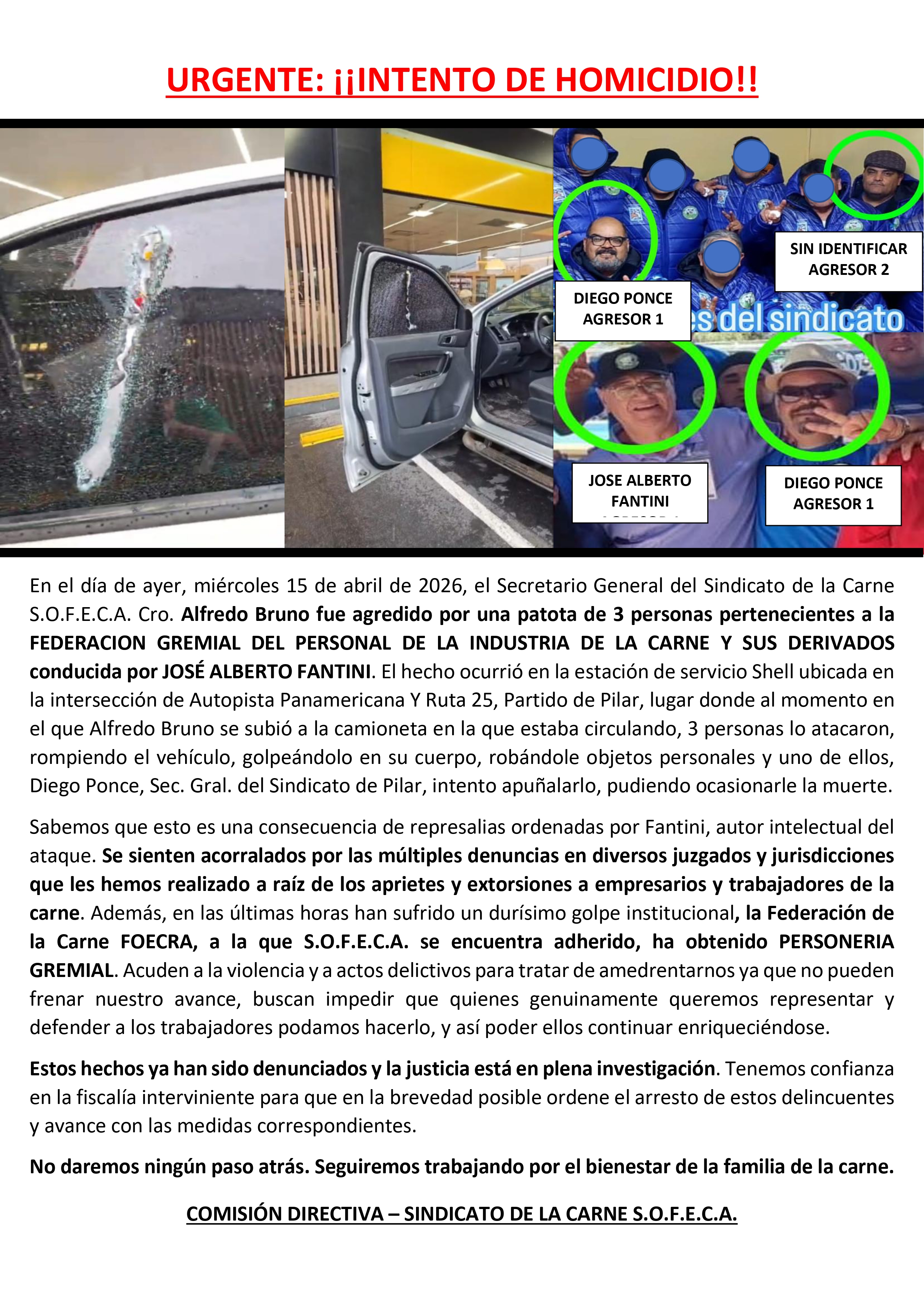 URGENTE: ¡¡INTENTO DE HOMICIDIO!! En el día de ayer, miércoles 15 de abril de 2026, el Secretario General del Sindicato de la Carne S.O.F.E.C.A. Cro. Alfredo Bruno fue agredido por una patota de 3 personas pertenecientes a la FEDERACION GREMIAL DEL PERSONAL DE LA INDUSTRIA DE LA CARNE Y SUS DERIVADOS conducida por JOSÉ ALBERTO FANTINI. El hecho ocurrió en la estación de servicio Shell ubicada en la intersección de Autopista Panamericana Y Ruta 25