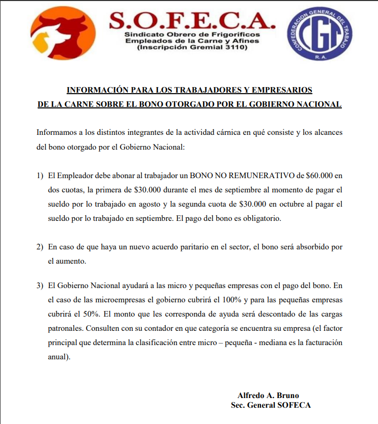 INFORMACIÓN PARA LOS TRABAJADORES Y EMPRESARIOS DE LA CARNE SOBRE EL BONO OTORGADO POR EL GOBIERNO NACIONAL Informamos a los distintos integrantes de la actividad cárnica en qué consiste y los alcances del bono otorgado por el Gobierno Nacional