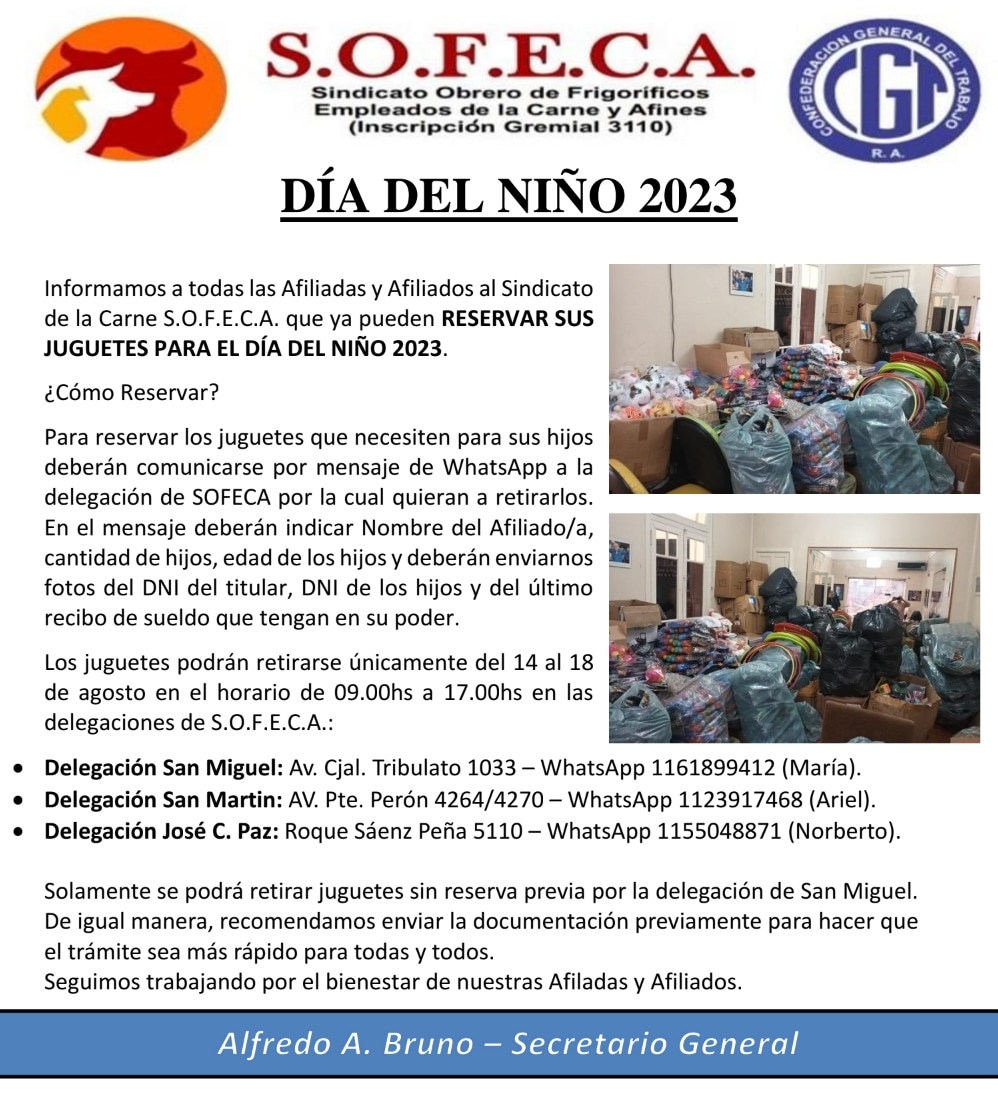 El sindicato de la carne SOFECA entrego juguetes el dia de reyes a hogares y hospitales de San Miguel