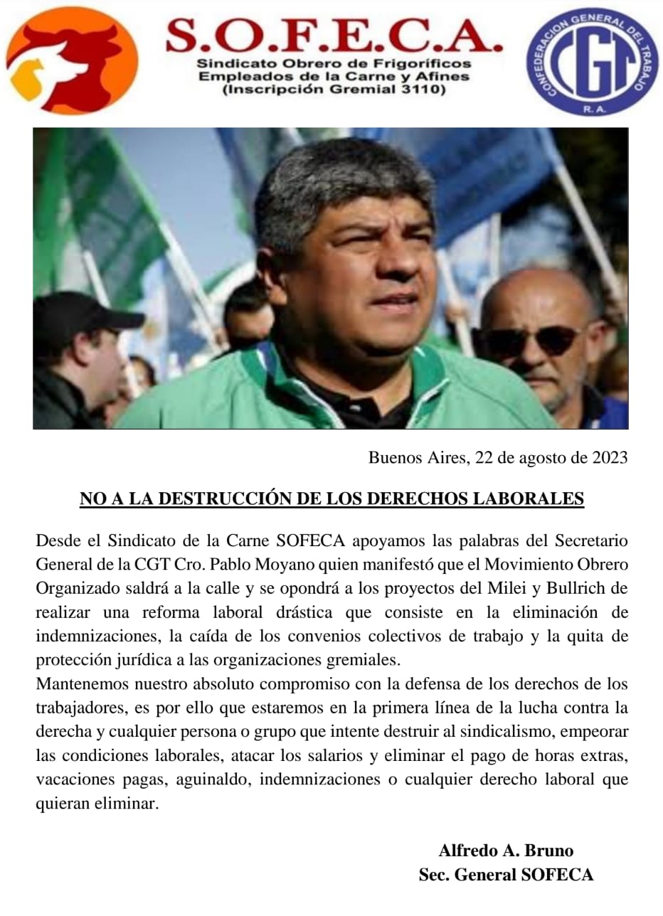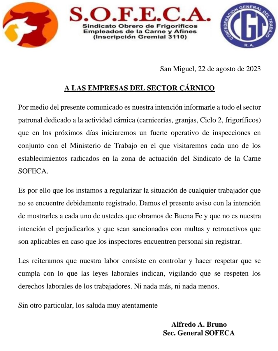 El SINDICATO OBRERO DE FRIGORIFICOS EMPLEADOS DE LA CARNE y AFINES (S.O.F.E.C.A.).